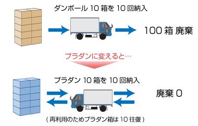 仕入れ業者から商品を仕入れる際、紙の段ボールで梱包されていることが多いですが、その後の段ボールは確実に大量廃棄処分となります。 プラダンは繰り返し使えるプラスチック製のダンボール 納入業者が紙製の段ボールをプラダンに変更し、箱を何回か使い回すことができたら…?ゴミとしての段ボールを片づける手間もなくなりますし、コストも下がることになります。
