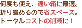 ![]() | 紙段ボールの代替に最適。おなじみのミカン箱型の箱です。折り曲げて箱にテープをしてとめるという、取扱いも紙段ボールと同じです。使い捨ての紙段ボールと違い、何度も使えるのでトータルコストの削減に! |
