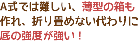 ![]() | C式とはお弁当箱のような形で、箱本体とふたの構造になっているタイプです。A式とは違い折り畳むことはできませんが、その分底に強度があります。 機械製品の部品など、少し重たいものを入れるのに適しています。 |